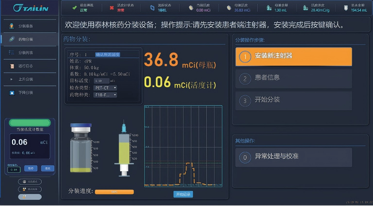 泰林正电子药物分装机具有自动分装核药功能,能根据临床需求活度剂量将母液分装至注射器,尤其适合正电子药物分装。