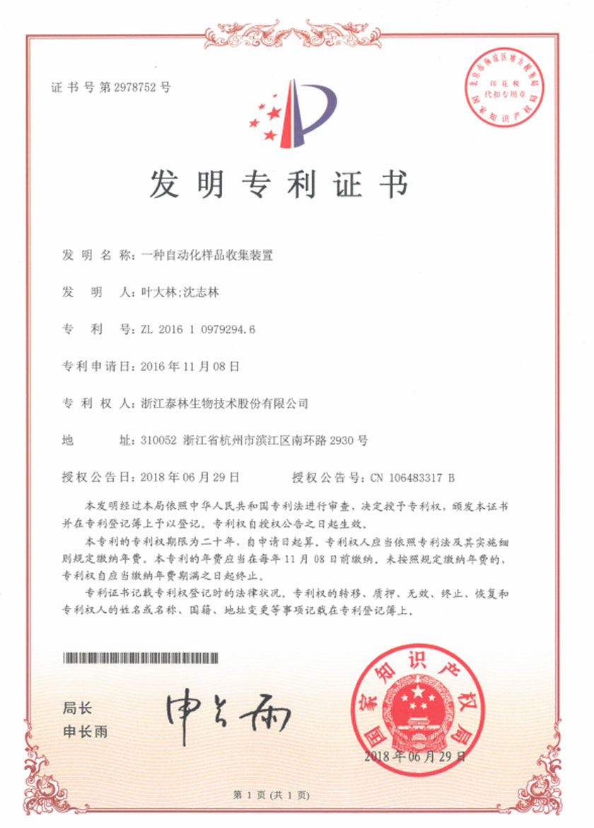 一种自动化样品收集装置ZL 2016 1 0979294.6 -